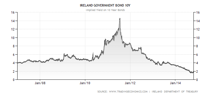 Irish 10 yr Gilts currently yield 1.82% down from July 2011 highs of 14.61% but they are off their recent lows of 1.62% seen last month.