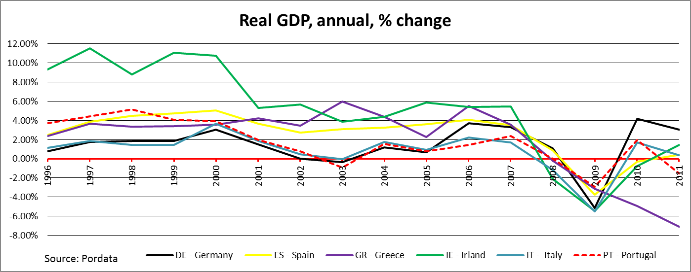 Ireland’s turn-around is in marked contrast to other countries of the Eurozone (EZ) periphery. The chart below shows Real GDP from 1996 to the end of 2010 for seven EZ countries:-