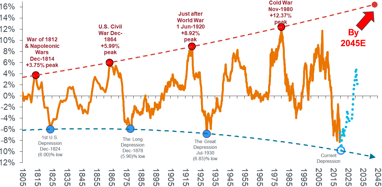 Source: Janus Henderson, Stifel Report June 2020. Note: Shown as 10yr rolling compound growth rate with polynomial trend at tops and bottoms. Blue dotted line illustrates a forecast estimation. Warren & Pearson Commodity Index (1795-1912), WPI Commodities (1913-1925), equal-weighted (1/3rd ea.) PPI Energy, PPI Farm Products and PPI Metals (Ferrous and Non-Ferrous) ex-precious metals (1926-1956), Refinitiv Equal Weight (CCI) Index (1956-1994), and Refinitiv Core Commodity CRB Index (1994 to present).