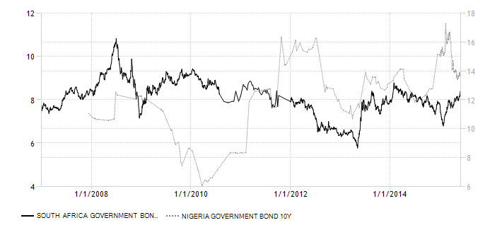 Source: Trading Economics, Central Bank of Nigeria and South African Treasury