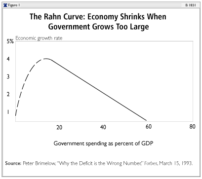China, like many other countries has a problem with debt. The FT recently published an estimate that the Chinese debt to GDP ratio was only 237% (lower than the Economist’s 260%) and government debt to GDP is only 43.9%, whilst household debt to GDP is 39.5%. The Heritage Foundation – Index of Economic Freedom 2016 – estimates China’s government spending to GDP at 29.3%, below that of many developed nations. The Rahn curve below shows how government spending can help to accelerate growth but the diminishing return once it rises above 15% of GDP:-