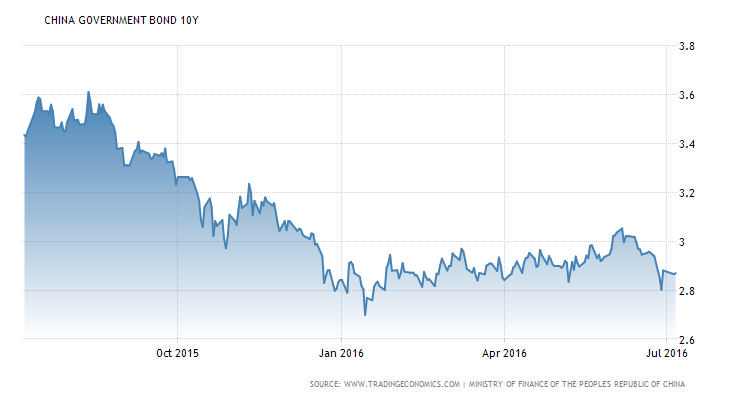10 year Chinese Government bonds have declined in yield as a result of the international turmoil created by Brexit, but, unlike many of major, international government bonds, they have not made new lows so far:-