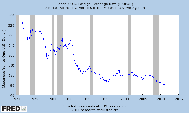 The Japanese currency will continue to weaken versus the US$. This chart from the St Louis Fed, which only goes up to 2012, shows how far the JPY has appreciated since the breakdown of the Bretton Woods agreement:-