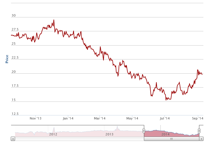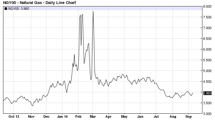 European Natural Gas prices are down from their December 2013 highs but have recently started to recover from the July 2014 lows. The chart below is for Dutch TTF (Title Transfer Facility) Gas: –
