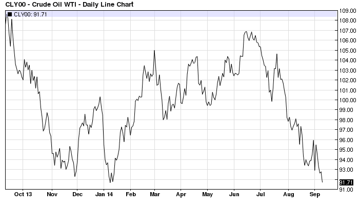 The US Crude Oil market is seemingly unperturbed by the politics of Russia or the Middle East. Or, perhaps, it is the combination of continuous improvements in US supply coupled with rising concern about the slowing of China. A similar pattern is evident in the Brent Crude price.