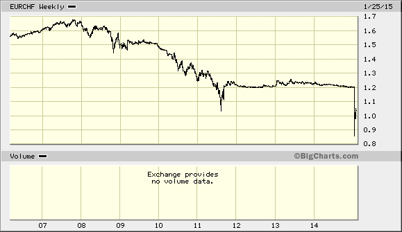 On Thursday 15th January the Swiss National Bank (SNB) finally, and unexpectedly, threw in the towel and ceased their foreign exchange intervention to maintain a pegged rate of EURCHF 1.20. The cap was introduced in September 2011 after a 28% appreciation in the CHF since the beginning of the Great Financial Crisis (GFC) – from 1.68 to 1.20. After plumbing the depths of 0.85 the EURCHF rate settled at 0.99 – around 18% higher in a single day. This is a huge one day move for a G10 currency and has inflicted collateral damage on leveraged traders, their brokers and those who borrowed in CHF to finance asset purchases in other currencies. Citibank estimates that is has also cost the SNB CHF 60bln. Here is a 10 year chart of EURCHF: –
