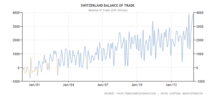 This chart only goes up to mid-2013, since then the USDCHF has moved from 0.88 and 0.99 by early January – after the unpegging the rate is near to its mid-point at 0.93. According to the Guardian – What a $7.54 Swiss Big Mac tells us about global currencies – the Swiss currency is now 33% overvalued. Exporters will be hit hard and the financial sector is bound to be damaged by commercial bank lending policies associated with pegging the CHF to a declining EUR. On Monday Bank Julius Baer (BAER.VX) announced plans to cut costs by CHF 100mln, domestic job cuts were also indicated – more institutions are sure to follow their lead. Meanwhile, there are bound to be emerging market borrowers which default. The Swiss economy will slow, exacerbating deflationary forces, but lower prices will improve the purchasing power of the domestic population. Switzerland’s trade balance hit a record high in July 2014 and came close to the same level in November:-