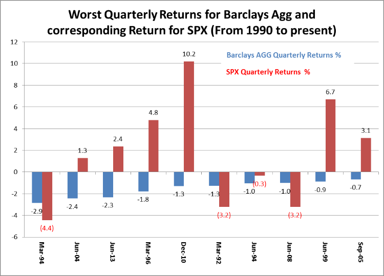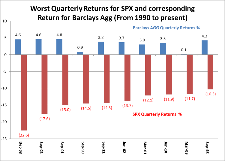 You can read his assessment of the current situation in this article – Silencing the Roar of the Bond Bear. In the past 25 years the largest negative quarterly return from the Barclays bond index was -2.9%, that was back in 1994 when the Fed tightened interest rates abruptly, causing stocks and bonds to collapse in tandem. The next chart highlights the benefits of diversification, generally bonds flip when stocks flop:-