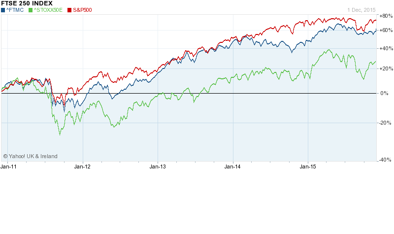 Here is the FTSE250 compared to EuroStox50 and the S&P500 – over the same five year period. The mid cap Index has followed the S&P, although in US$ terms its performance has been less impressive:-