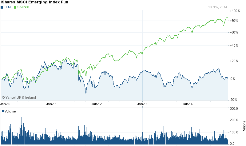 The chart below shows the relative performance of the S&P500 Index vs MSCI Emerging Market ETF (EEM) over the last five years, after an initial rebound from the Great Recession the US stock market began to outperform other stock markets, driven by the economic boon of oil and gas technology, the implementation of TARP and the highly accommodative policies of the Fed. With the current round of QE at an end, US investors may need to look further afield in search of value :-