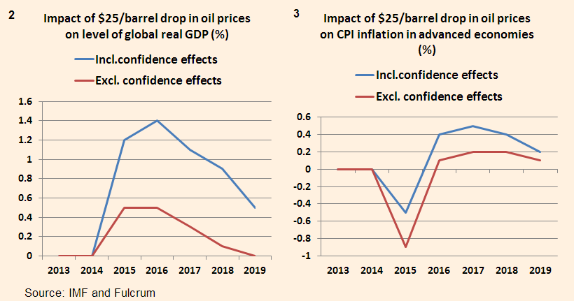 The effect of lower oil prices is felt quite rapidly by consumers globally. Oil consumers, at the household level, receive an immediate boost to their real income. This “wind-fall” is then either spent or saved. An explanation of these effects can be found in this Gavyn Davies article in the Financial Times – Large global benefits from the 2014 oil shock (Some of you may need to subscribe to this “limited free service”). He uses IMF data to produce two very interesting charts: –