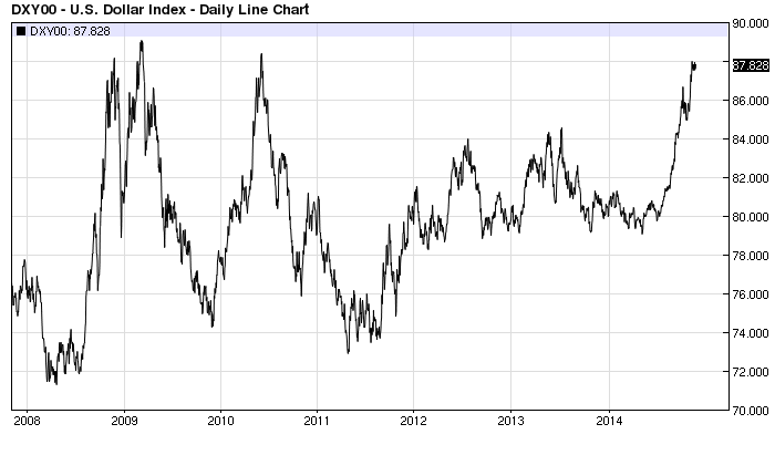 The fall in oil prices has been mirrored, inversely, by the rise of the US$. This trend is already well established but I expect it to continue. This is not so much a reflection of the strength of the US economy as the moribund nature of growth expectations in the EU and Japan.